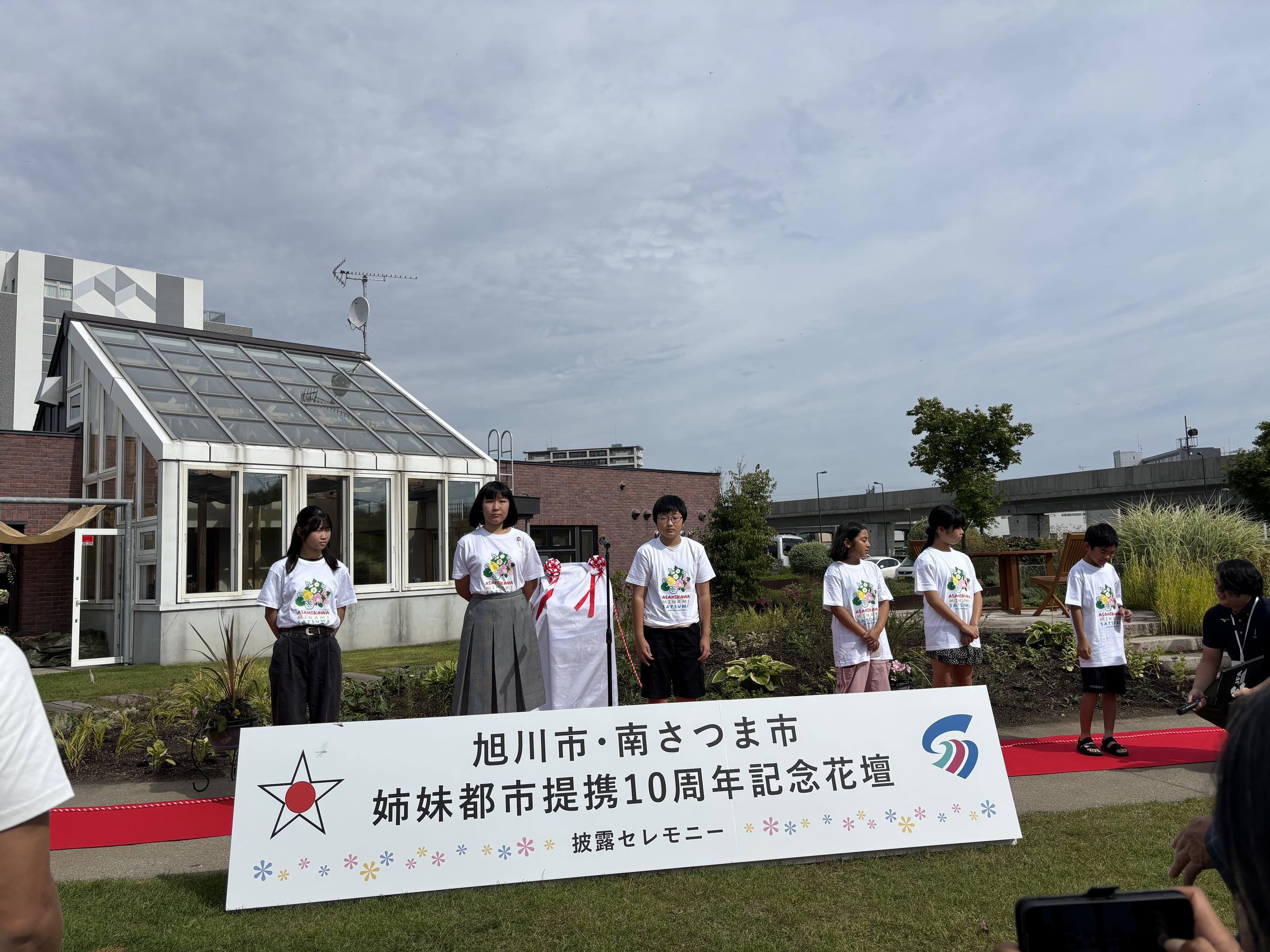 9月13日(土曜日)に旭川市・南さつま市姉妹都市提携10周年記念花壇披露セレモニーを開催し、両市長が挨拶を行ったほか、青少年交流に参加した子どもたちによるメッセージや花壇の除幕を行いました。また、これまでに南さつま市で砂像を制作した砂像制作隊が寄植えし、セレモニーに花を添えました。