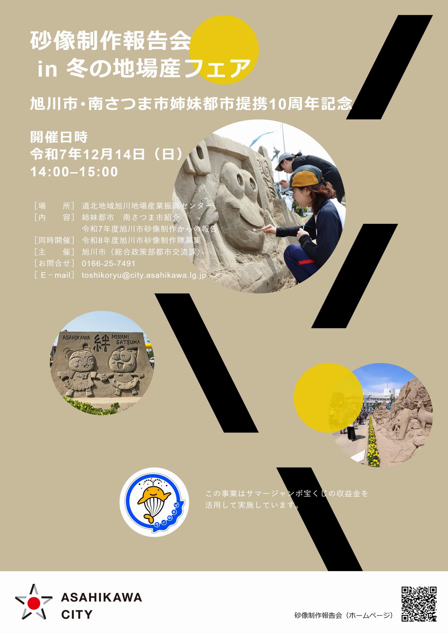 また、来年5月に南さつま市で開催する「2026吹上浜砂の祭典」へ派遣予定の令和8年度旭川市砂像制作隊の募集概要説明も行いますので、是非、御来場ください。