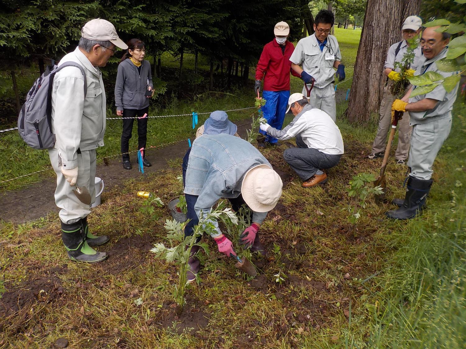 (1)自然更新ゾーンの移植位置検討・移植作業 ・ドロノキの移植 (2)日本庭園エリアの視察 |