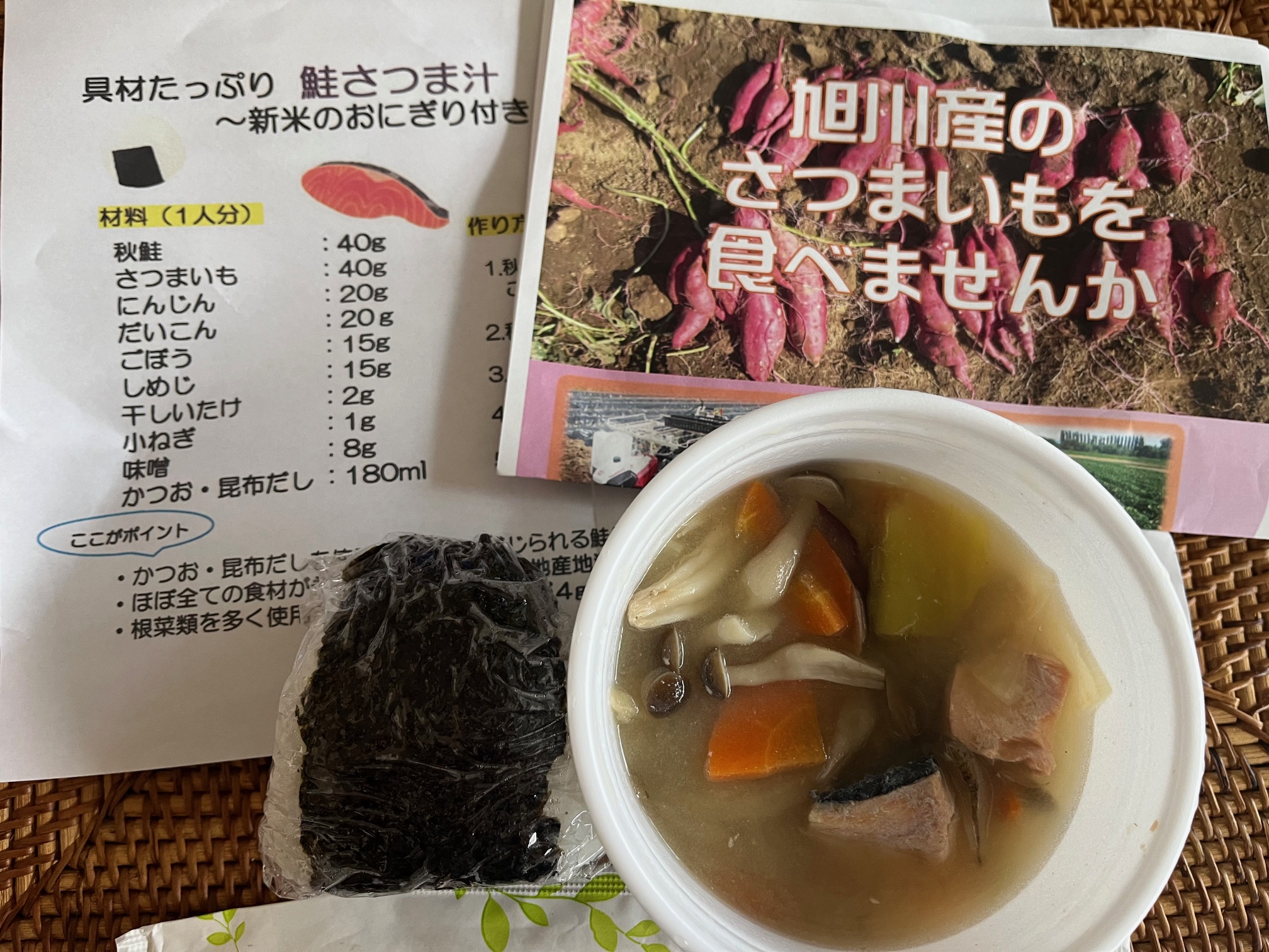 今回のメニューは、永山で採れたゆめぴりかと野菜たちで作った新米おにぎりと秋を感じる三平汁。大きな鮭も入っていて、タンパク質もしっかり補給。心にも体にもたくさんの栄養をお届けしました。
