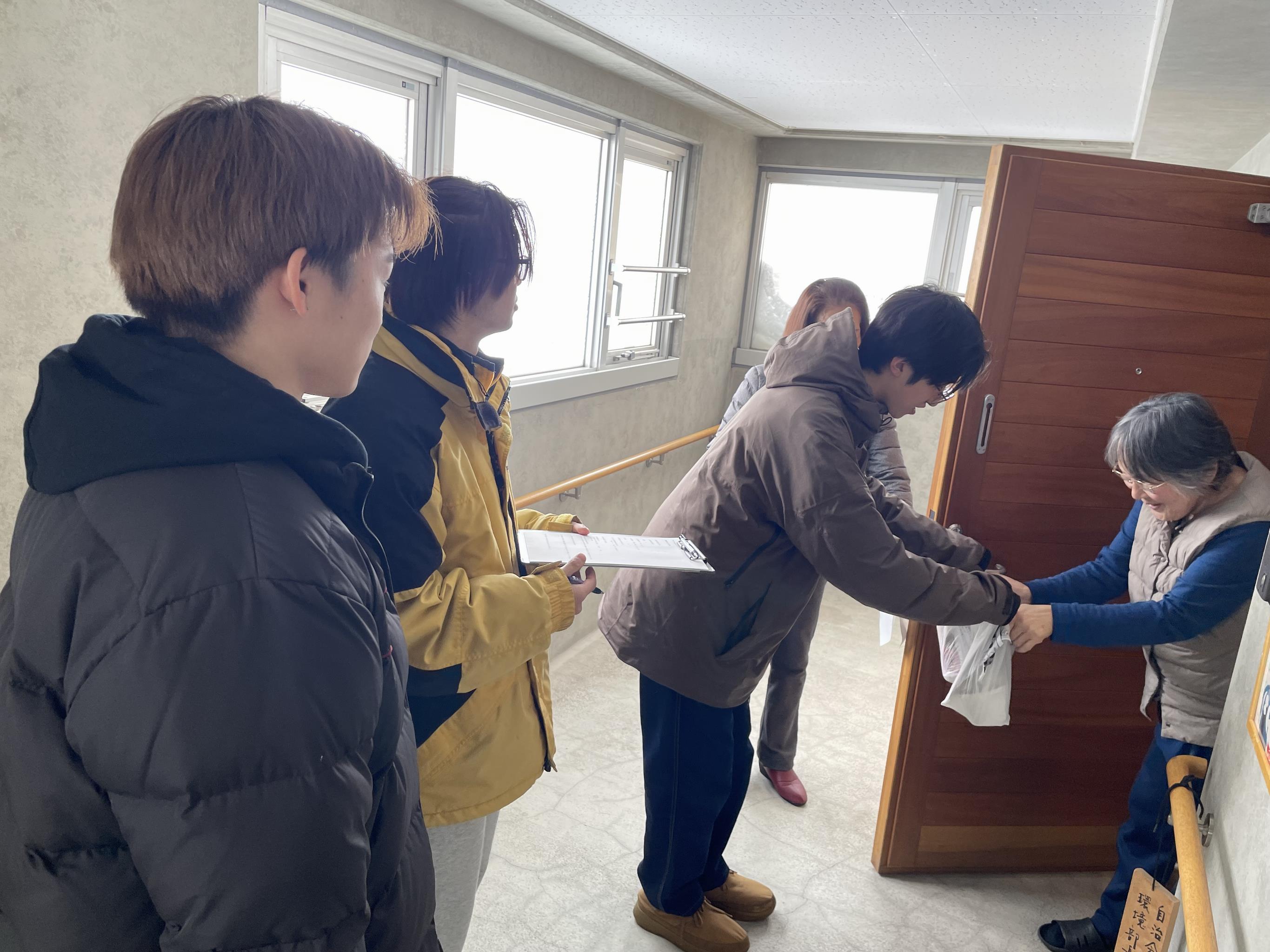 温かいスープをお届けし、きずなを深める事業として今年は3回実施。第2団地、3区第2町内会、むつみ町内会に伺いました。旭川市立大学短期大学部「お料理研究サークル」が調理した、地元産野菜たっぷりのさつま汁とおにぎりを町内会、民生児童委員、地域の方の協力を得て、学生が一人暮らしの高齢者宅などにお届けしました。学生と地域の方が訪問すると、「楽しみに待っていた」と笑顔で迎えてくれた方、姿が見えなくなるまで見送ってくださった方もおられ、心もからだも温まる交流ができました。