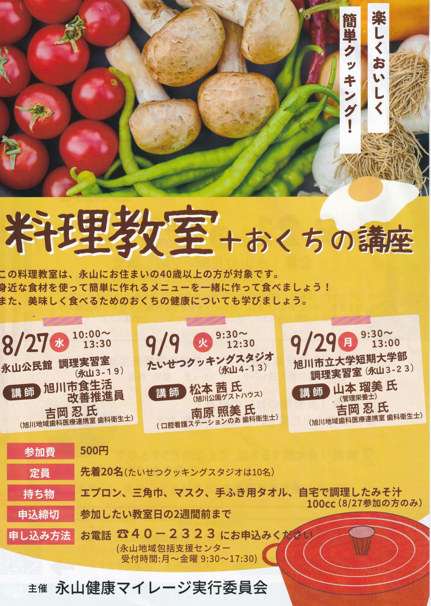 また、永山にお住まいの40歳以上の方を対象とした、簡単に作れて栄養もとれる献立の調理実習とおくちの健康講座がセットとなった 「クッキング教室+おくちの健康講座」を開催しました。