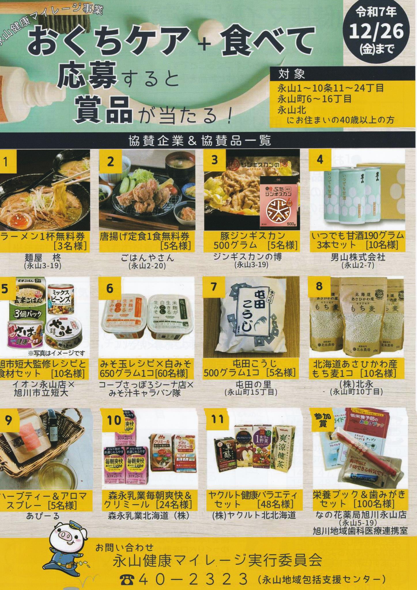 毎日のおくちケアや10食品群チェックシートで食べた食品をチェックしたり、令和6年10月から始まった後期高齢者歯科検診を受信することで、健康に関するグッズや永山に関する商品が当たるキャンペーンを実施しました。