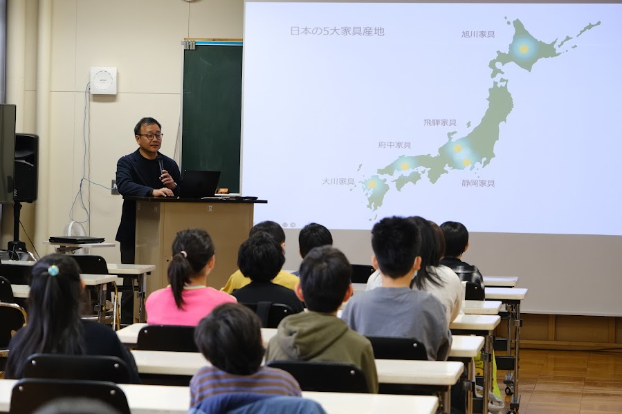 はじめに旭川家具工業協同組合の職員から、日本5大家具産地の一つである旭川家具の歴史や、現在の取り組みについて学びました。