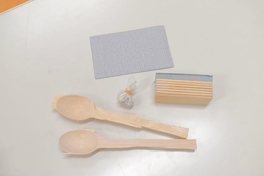 大まかにスプーンの形になっている材料をサンドペーパーで少しずつ削り、手触り良く仕上げます。