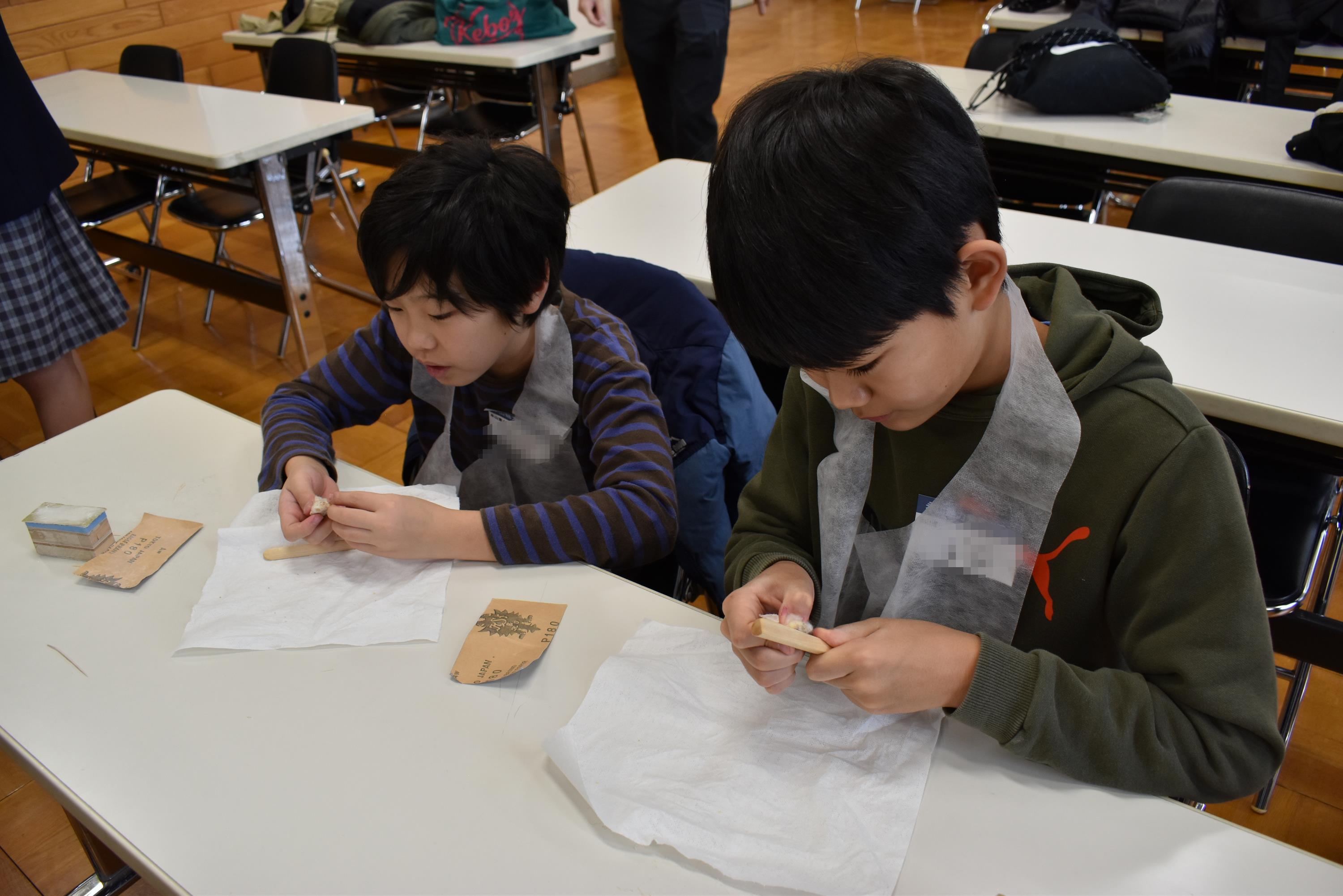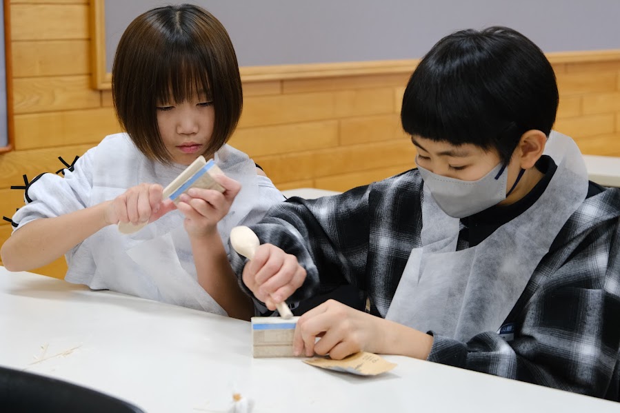 次に、北海道産木材を使用した木のスプーン制作と、農業高校で採れたサツマイモを使ったムースタルトの調理を行いました。