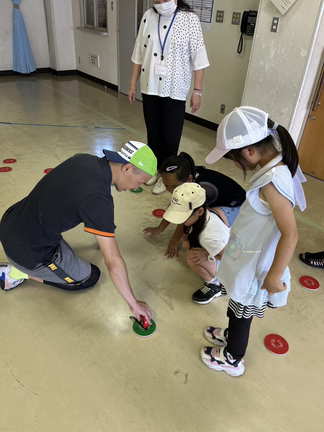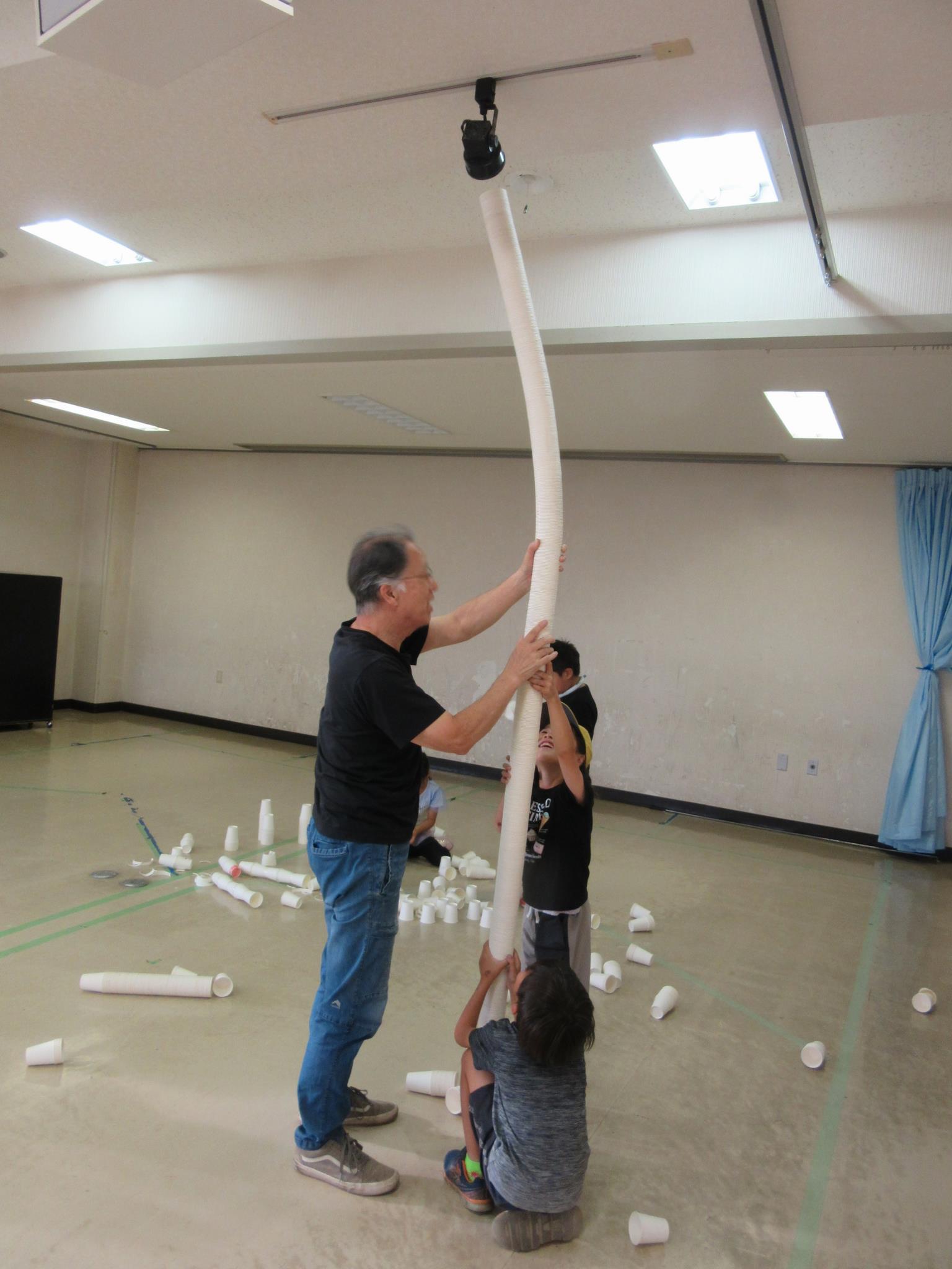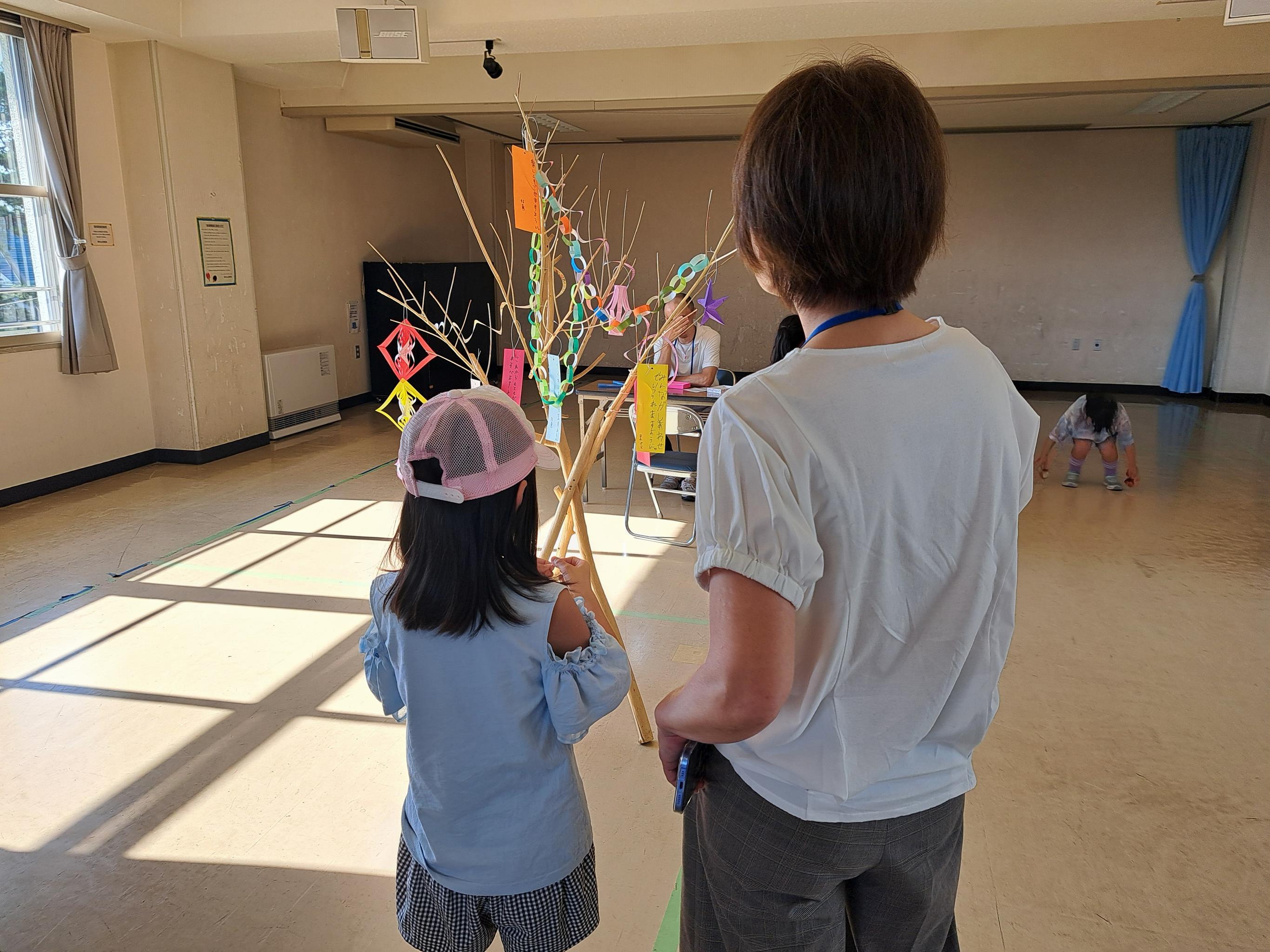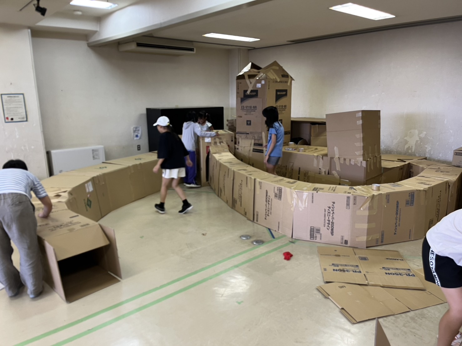 地域の小学生が放課後などに安心して過ごせて、住民同士の交流の場となっている「愛あい(子どもの居場所づくり)」では、段ボールや紙コップ、木や枝、新聞紙などの身近な材料を活用し、創意工夫をしながら楽しめる遊びを実施しています。