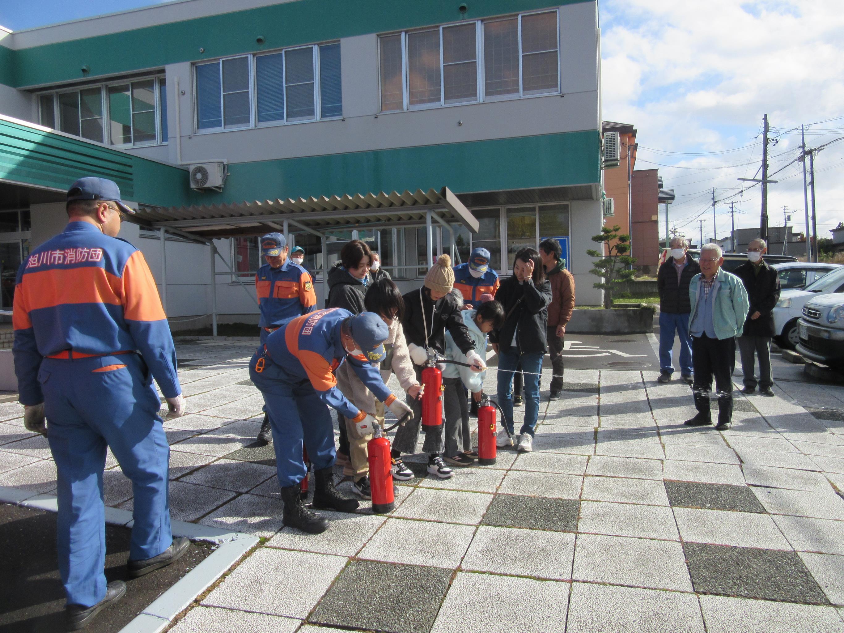 豊岡地区センターで行われた消防訓練に豊岡消防団活性化実行委員会(旭川市消防団第4分団)が協力しました。