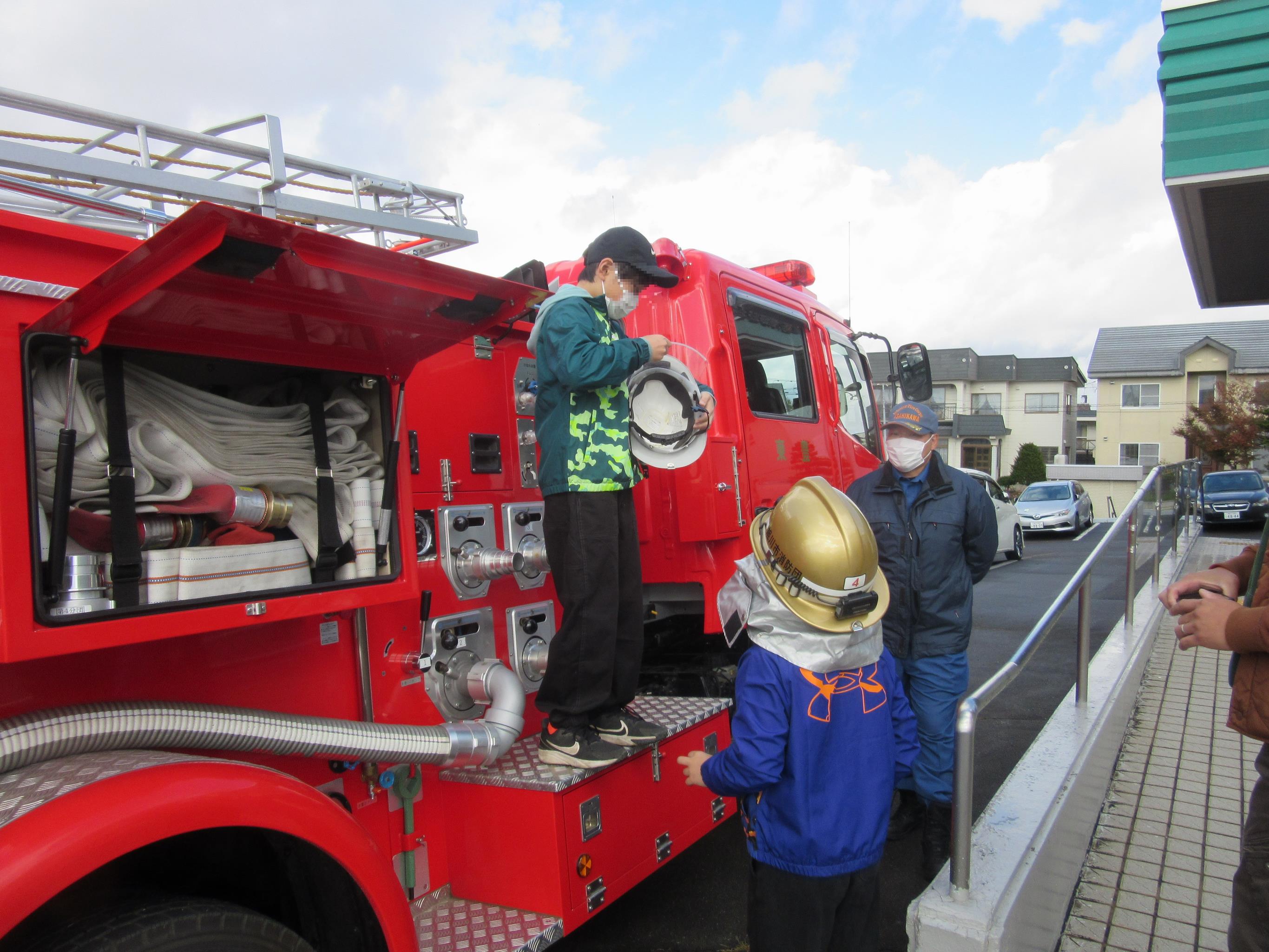 豊岡地区センター内での避難訓練、通報訓練の後、屋外で消火器の使い方の実践、消防車見学などを行いました。