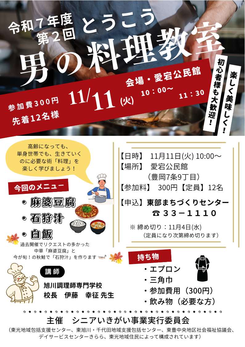 今回のメニューは「麻婆豆腐」と今が旬の魚、秋鮭をつかった「石狩汁」を作ります。講師に旭川調理師専門学校校長 伊藤先生をお迎えし、楽しく料理を学びましょう!初心者の方も、料理が好きな方もどなたでも大歓迎です。