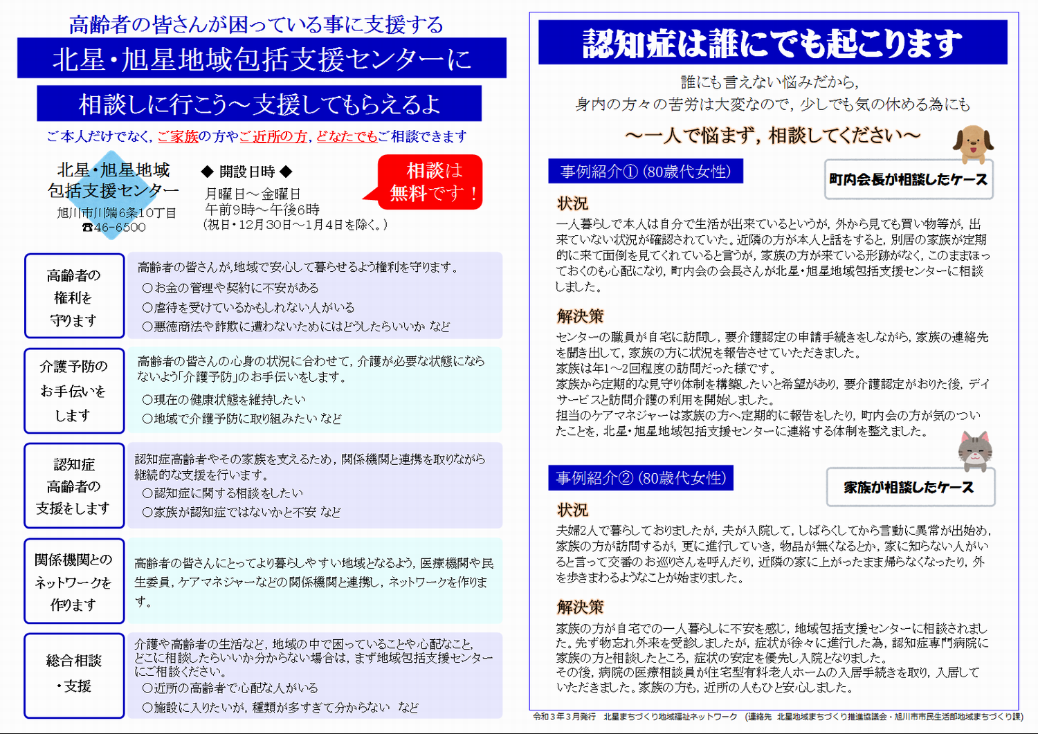 今年度は、高齢者の困りごとの相談窓口などの情報を掲載したチラシ「高齢者にやさしいお役に立つ福祉のまち通信」を作成し、北星地域に全戸配布しました。