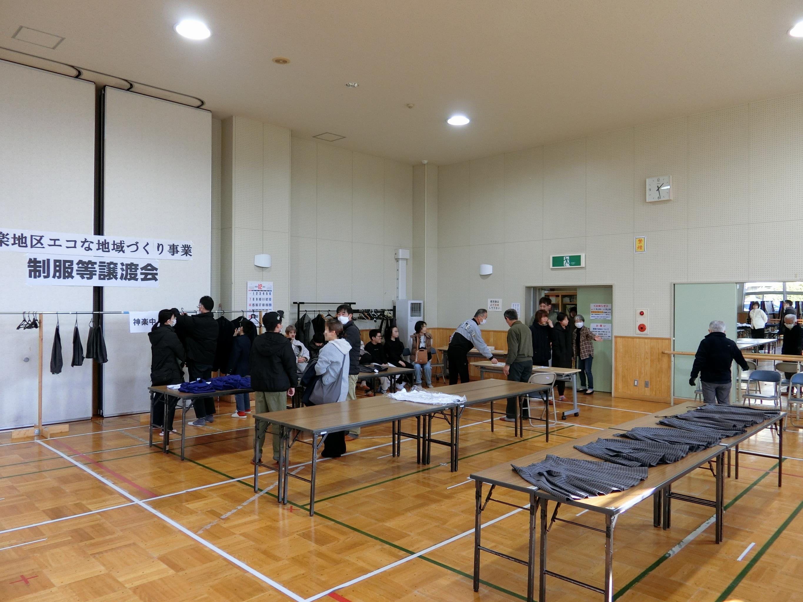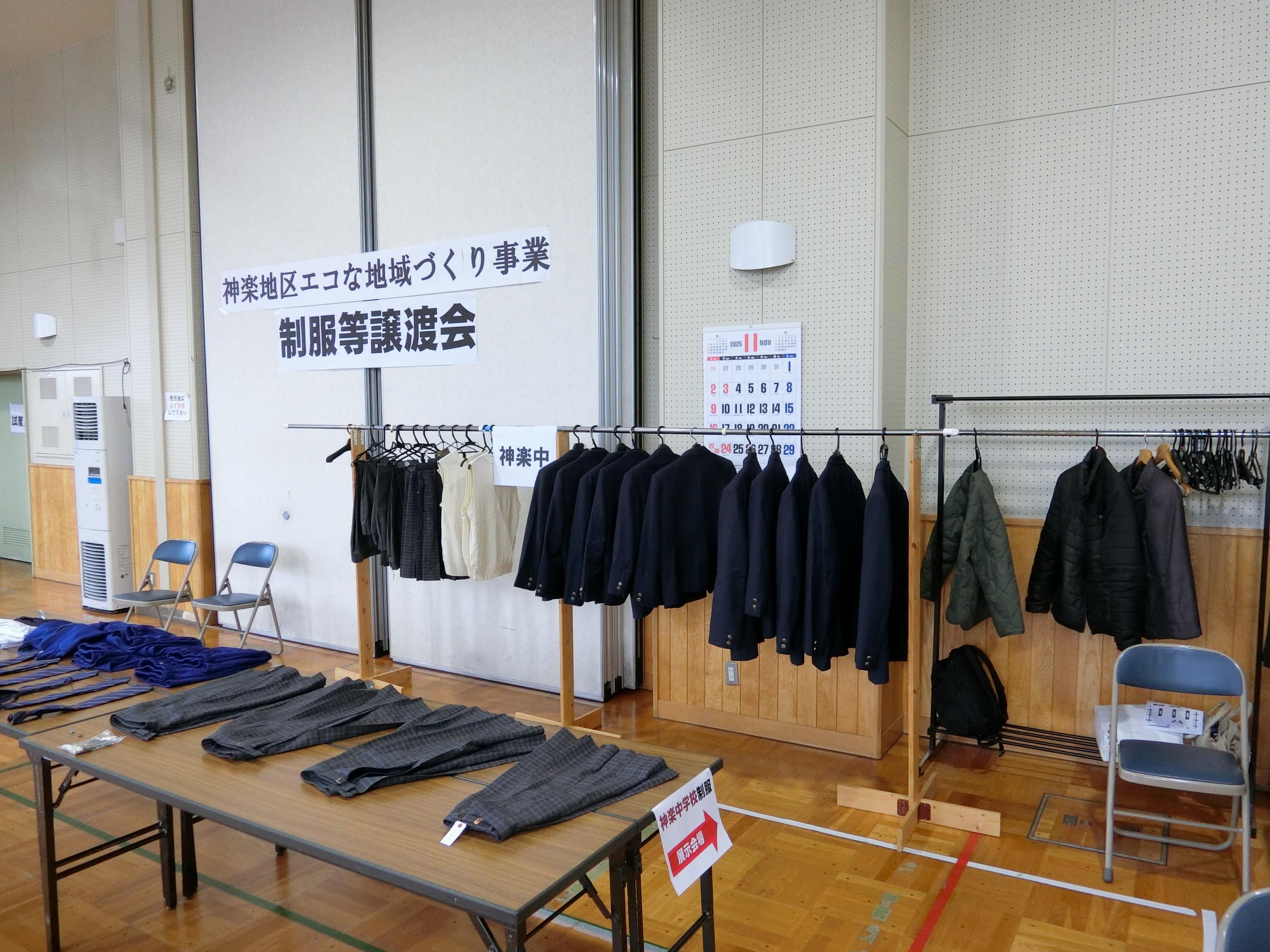 【内容】 家庭で不要になった中学・高校の制服などを、地域住民や卒業生から募集(神楽公民館及び神楽岡地区センターで受付)した後、譲渡会場において譲り渡しました。地域の皆さんからは、経済的な負担を減らす取り組みとしても好評で喜ばれています。