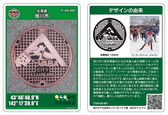 マンホールカードは、マンホール蓋の情報を載せたコレクションカードです。下水道広報プラットホーム(GKP)が企画し、マンホールを管理する都道府県や市町村と共同で制作しています。全国のマンホール蓋には自治体によって様々なデザインがあり、その地方ならではの歴史や文化などが表れています。マンホールカードにはマンホール蓋の写真と位置情報のほか、デザインの由来などが記載されており、手にすることで様々な楽しみ方ができます。 地中に埋まっていて、普段はあまり注目されることのない下水道ですが、自然を守り、私たちの快適で安全な暮らしや仕事を陰で支えています。旭川市水道局では、下水道のことをもっと知っていただくきっかけになればとの思いから、平成29年に本市で初となるマンホールカードを作成し、令和6年に2種類目のマンホールカードを作成しました。