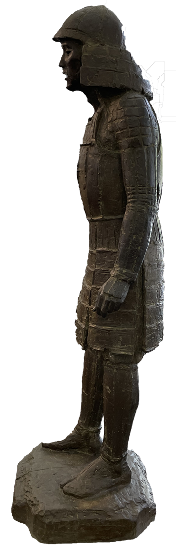 甲冑をまとった像は、武器を持たず、やや前かがみに立つ姿で表されています。肩に力を込めつつも、腕は体側に垂れ下がり、両手は中途半端に開かれたままです。その姿勢は、戦う意志よりも、立ち尽くす無力さや悲哀を感じさせます。特に眼窩(目のくぼみ)は大きく抉られ、埴輪のように眼球は造形されていません。本来なら最も感情を伝えるはずの「目」が虚無の空洞として示されることで、観る者の想像力を喚起し、武者の内面を「沈黙の叫び」として伝えています。